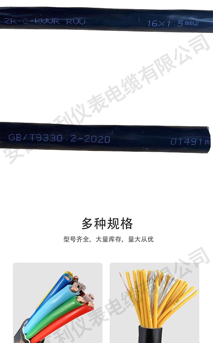 控制电缆适用于工矿企业、能源交通部门、供交流额定电压450/750伏以下控制、保护线路等场合使用的绝缘,护套控制电缆。控制电缆的使用特性:额定电压:U0/U为450/750V。导体线芯长期工作温度为70℃、95℃两种,电缆敷设温度不低于0℃。电缆的推荐允许弯曲半径如下:无铠装电缆,应不低于电缆外径的6倍;铠装或铜带屏蔽电缆,应不低于电缆外径的12倍;屏蔽软电缆,不低于电缆外径的6倍。控制电缆泛指设备仪表供电/信号控制代表型号:KVV/KYJV/还有其它仪表线等等控制电缆产品说明执行标准:GB/T9330-2008。